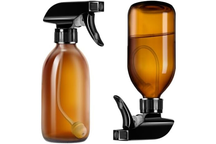 Tecohouse Amber Glass Spray Bottles 8oz, 2 Pack 360° Water Spray Bottle for Cleaning Upside Down Spray Bottles Mister Squirt Bottle with Adjustable Nozzle for Hair, Plant, Pet