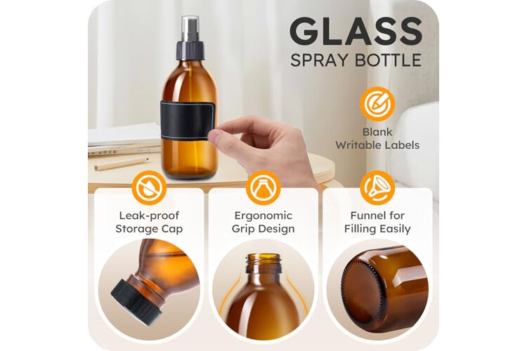 More Accessories: Glass Spray Bottles Set includes 1 funnel for easy filling, 2 reusable black and white labels for quick recognition and a user manual.