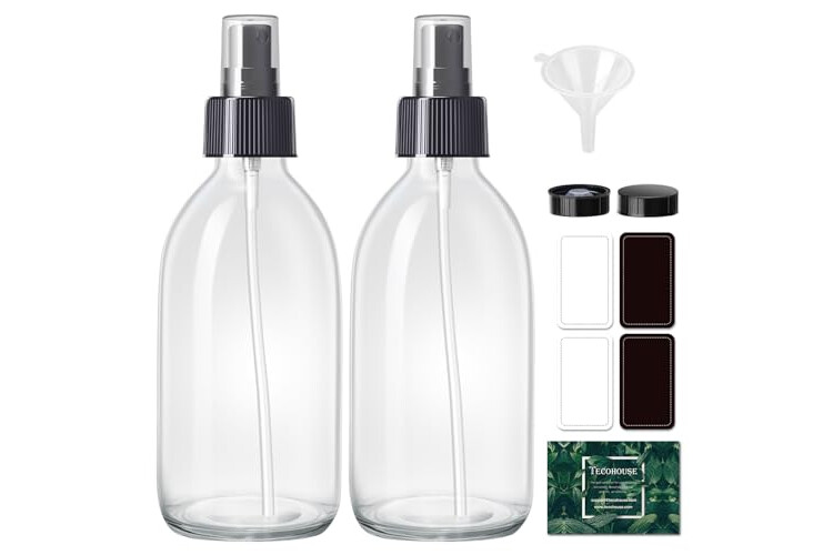 Tecohouse 2 Pack Glass Spray Bottles, 250ml Small Glass Bottles for Cleaning Solutions, Spray Bottles for Essential Oils, Plants, with Durable Nozzle, Labels, Funnel - Clear