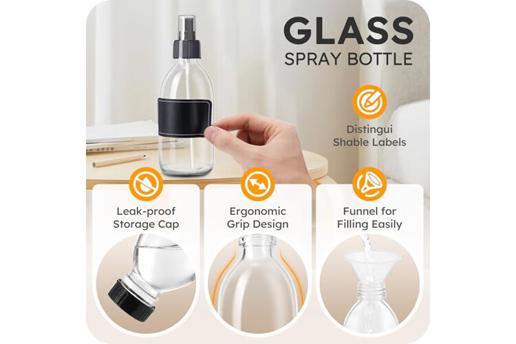 • More Accessories: Glass Spray Bottles Set includes 1 funnel for easy filling, reusable black and white labels for quick recognition and a user manual.
