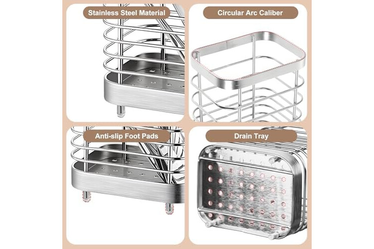 High Quality Stainless Steel Material: This kitchen utensil holder is made of durable stainless steel, and there are 4 cylindrical feet at the bottom, which can firmly fix the kitchen utensil rack on the countertop without sliding or shaking.