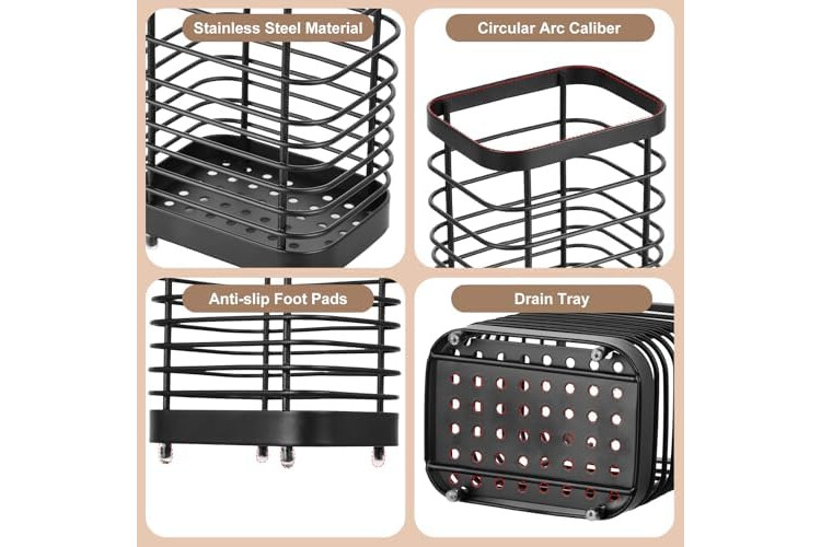 High Quality Stainless Steel Material: This kitchen utensil rack is made of durable stainless steel and uses 4 sturdy cylindrical legs to securely attach to the countertop without slipping or wobbling.