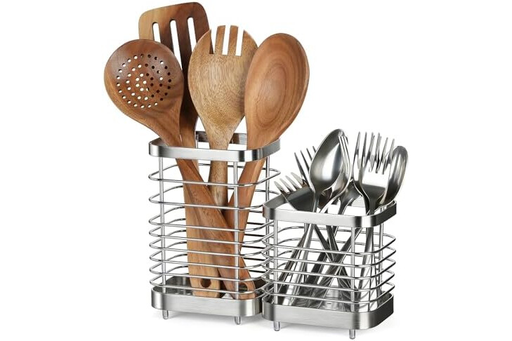 • Package Contains: The package contains 1pcs stainless steel kitchen utensil holder, tall and short utensil versions are welded together. The small cutlery storage container is also a thoughtful gift for friends to move to their new homes.