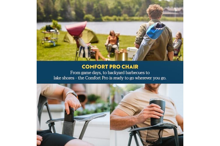 A FRONT ROW SEAT. Perfect for sports games or backyard lawn BBQ, the Comfort Pro is ready for anything. With a beverage holder built into the armrest, a secure phone pocket and great back support, you can enjoy more time outside with family and friends.