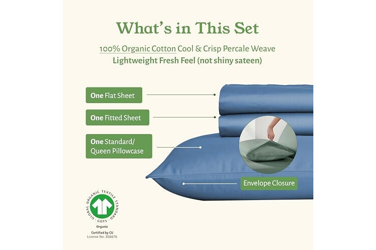OUR SHEET SET HAS EARNED THE GOOD HOUSEKEEPING SEAL (GOTS Certified 100% Organic Cotton Sheet Set): Classic Percale Sheets. Gentle on skin, these organic twin XL sheet sets cotton bedding are made using 100% organic cotton percale fabric and offer a balance of crispness and breathability. These durable bed sheets have a beautiful matte finish and a crisp touch. Independently tested to earn the prestigious Good Housekeeping Seal.