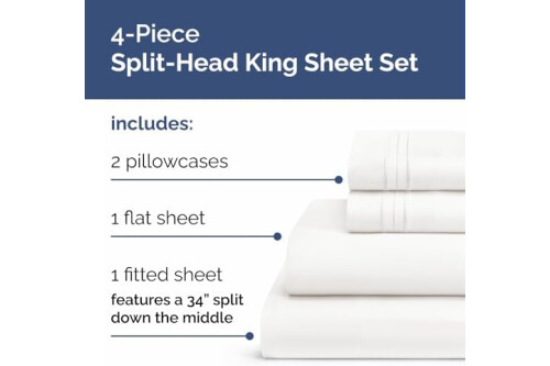 4 PIECE SPLIT KING HEAD SHEETS SET: Elevate your bedroom with our flex top King sheets designed with a sleek, modern look. The split head king sheet set includes 2 pillowcases 20” x 30”, a Flat sheet 102” x 108” and a Fitted sheet 78” x 80” which features a 34” split down the top middle.