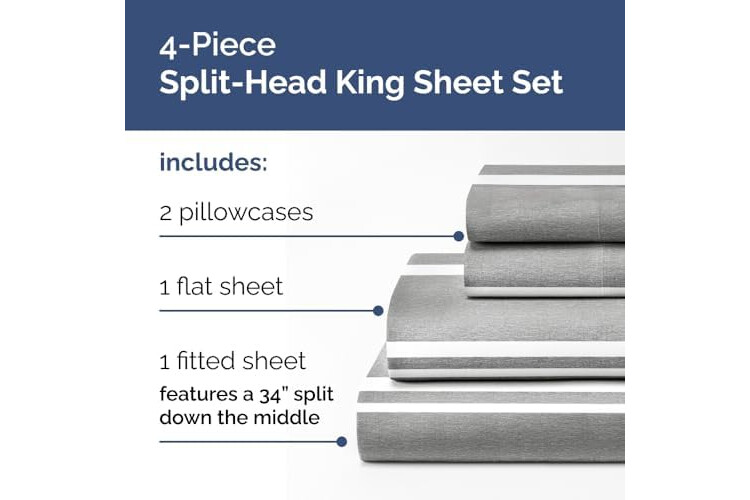 4 PIECE SPLIT KING HEAD SHEETS SET: Elevate your bedroom with our flex top King sheets designed with a sleek, modern look. The split head king sheet set includes 2 pillowcases 20” x 30”, a Flat sheet 102” x 108” and a Fitted sheet 78” x 80” which features a 34” split down the top middle.