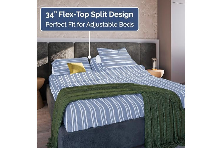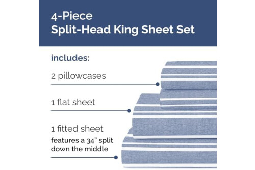 4 PIECE SPLIT KING HEAD SHEETS SET: Elevate your bedroom with our flex top King sheets designed with a sleek, modern look. The split head king sheet set includes 2 pillowcases 20” x 30”, a Flat sheet 102” x 108” and a Fitted sheet 78” x 80” which features a 34” split down the top middle—great for families, kids, teens, and sleepovers in guest rooms, bunk rooms, and kids’ bedrooms.