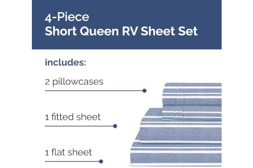 4 PIECE RV SHORT QUEEN SHEET SET: This RV Short Queen sheet set stays perfectly in place whether it is for a RV Short Queen Mattress or RV camper. It includes 2 pillowcases 20” x 30”, a Flat sheet 90” x 102” and a Fitted Sheet 60” x 75”. Our premium RV Short Queen sheets will allow you to enjoy a smooth, wrinkle-free bed without the hassle of constant adjustments or re-tucking.