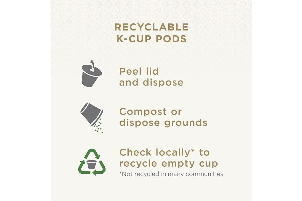 Recyclable: Peet's K-Cup Pods are fully recyclable - peel, compost or dispose grounds & recycle. Check locally, not recycled in all communities.