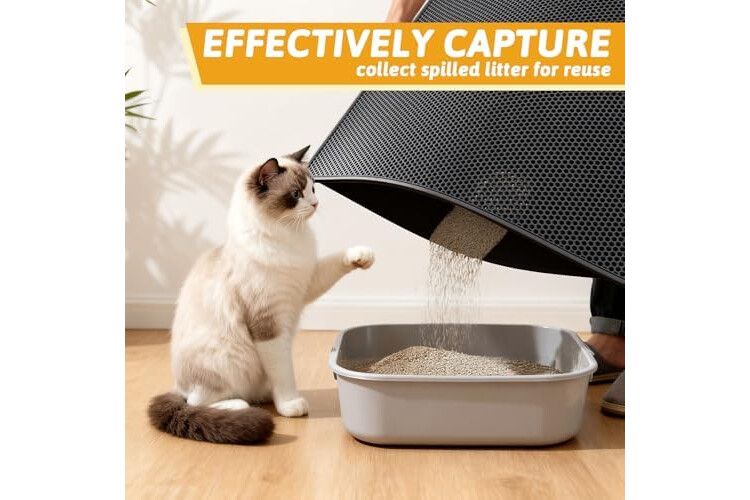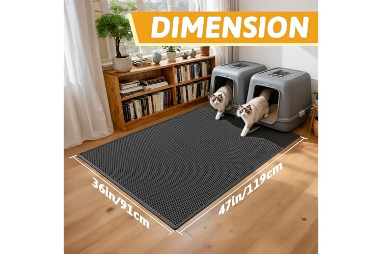 Anti Tracking EZ Open Edge Litter Mat: Double-layer honeycomb design helps you gather the litter. You just pick up the mat and all the litter falls through and then dump it back in the litter box make it recycling. No more getting litter stuck to my feet on a daily basis! Large holes is large enough to catch and trap litter. Suitable for lots of type of litter, and kitty litter boxes,hooded,self cleaning litter box.