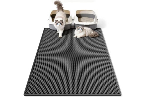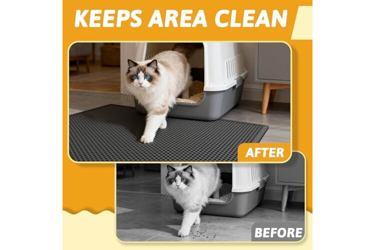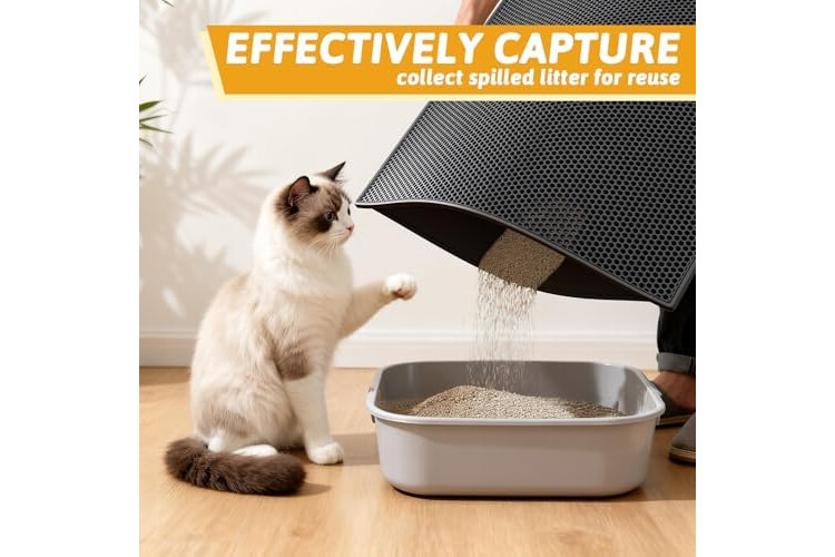 Anti Tracking EZ Open Edge Litter Mat: Double-layer honeycomb design helps you gather the litter. You just pick up the mat and all the litter falls through and then dump it back in the litter box make it recycling. No more getting litter stuck to my feet on a daily basis! Large holes is large enough to catch and trap litter. Suitable for lots of type of litter, and kitty litter boxes,hooded,self cleaning litter box.