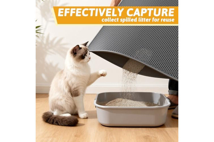 Anti Tracking EZ Open Edge Litter Mat: Double-layer honeycomb design helps you gather the litter. You just pick up the mat and all the litter falls through and then dump it back in the litter box make it recycling. No more getting litter stuck to my feet on a daily basis! Large holes is large enough to catch and trap litter. Suitable for lots of type of litter, and kitty litter boxes,hooded,self cleaning litter box.