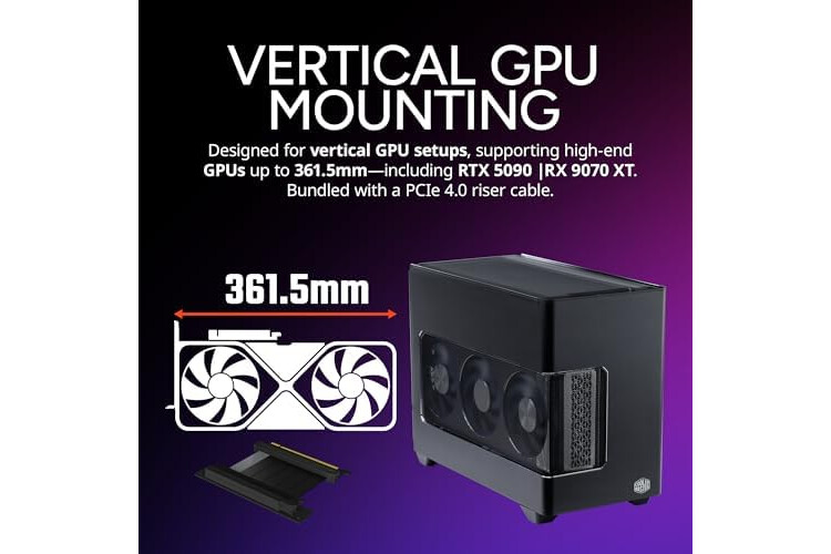 Vertical GPU Mounting: Designed for vertical GPU setups, supporting high-end GPUs up to 361.5mm—including RTX 5090 |RX 9070 XT. Bundled with a PCIe 5.0 riser cable.