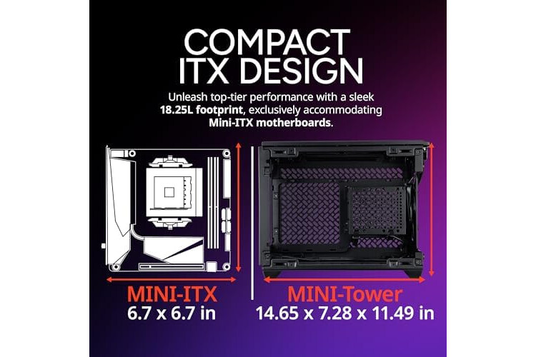 Compact ITX Design: Unleash top-tier performance with a sleek 18.6L footprint, exclusively accommodating Mini-ITX motherboards.