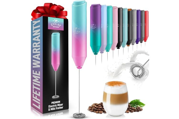 Zulay Kitchen Powerful Milk Frother Wand - Handheld Stainless Steel - Battery Operated Drink Mixer for Coffee, Lattes, Cappuccino, Matcha - Froth Mate Frother Gift - Teal Pink Fade