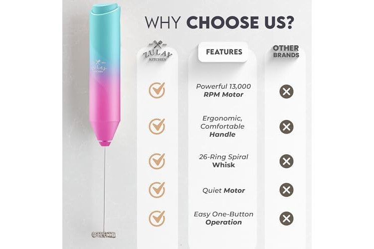 • POWERFUL FROTHING EXPERIENCE: Skip the coffee shop run and enjoy lattes, cappuccinos, matcha, hot chocolate, powdered drinks, or iced coffee at home with this milk frother. With a 13,000 RPM motor and 26 spiral rings, this coffee foam maker turns ordinary milk to frothy perfection in seconds.