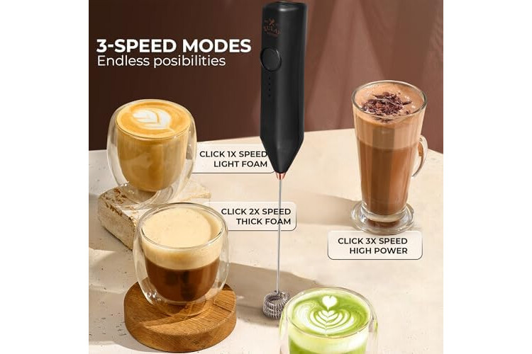 3 SPEEDS FOR CUSTOM FROTHING CONTROL: Choose from low, medium, or high speed to achieve the perfect froth for lattes, cappuccinos, matcha, hot chocolate, and more. This handheld milk frother gives you precise power at the touch of a button.