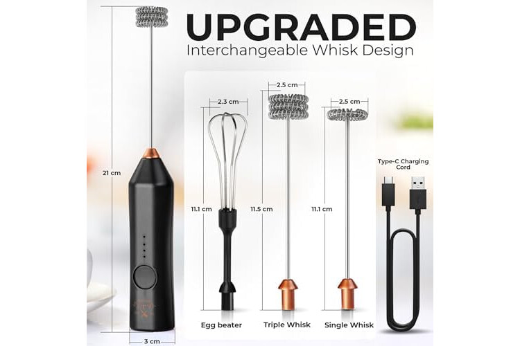 INCLUDES 3 VERSATILE WHISK ATTACHMENTS: Comes with a single coil whisk for light froth, a double coil whisk for dense foam, and a balloon whisk for blending and whipping. Easily swap attachments to match your drink or recipe needs.