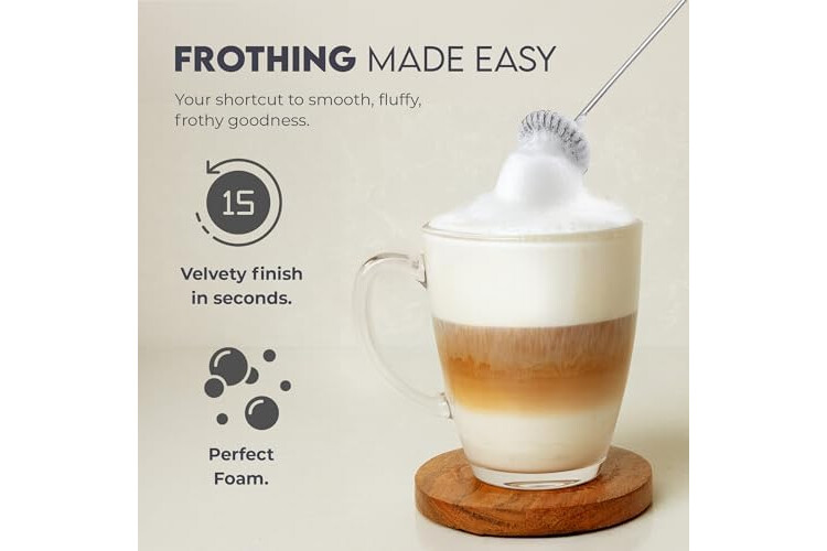 Fast, Smooth Froth: This handheld frother whips milk into creamy foam in seconds, perfect for lattes, cappuccinos, matcha, and more.