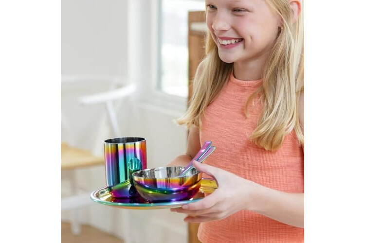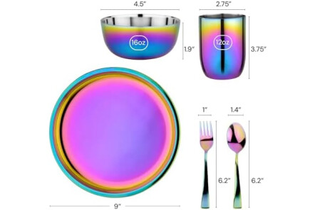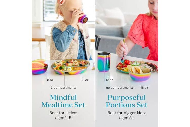 PREMIUM 304 STAINLESS STEEL QUALITY: Crafted from high-grade, food-safe 18/8 stainless steel trusted in hospitals and homes alike. This stainless steel kids plates and bowls set is unbreakable, rust-resistant, and dishwasher-safe — a long-lasting upgrade from plastic, bamboo, or silicone kids dinnerware sets.