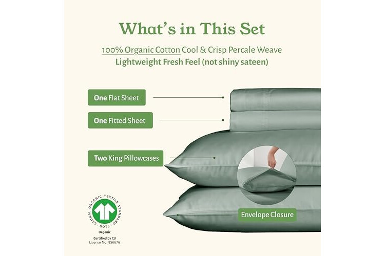 OUR SHEET SET HAS EARNED THE GOOD HOUSEKEEPING SEAL (GOTS Certified 100% Organic Cotton Sheet Set): Classic Percale Sheets. Gentle on skin, this california king sheet sets cotton bedding is made using 100% organic cotton percale fabric and offers a balance of crispness and breathability. These durable bed sheets have a beautiful matte finish and a crisp touch. Independently tested to earn the prestigious Good Housekeeping Seal.