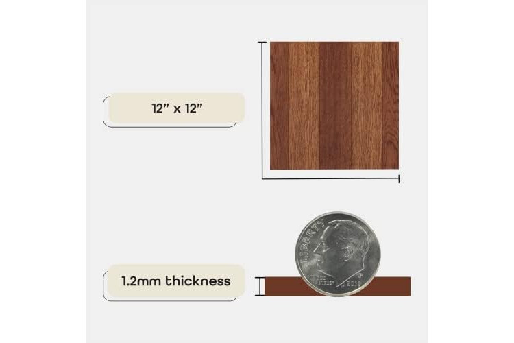 Dimensions: Each tile measures 12 inches x 12 inches and 1.2mm thick. There are 20 tiles per box, which will cover 20 square feet.