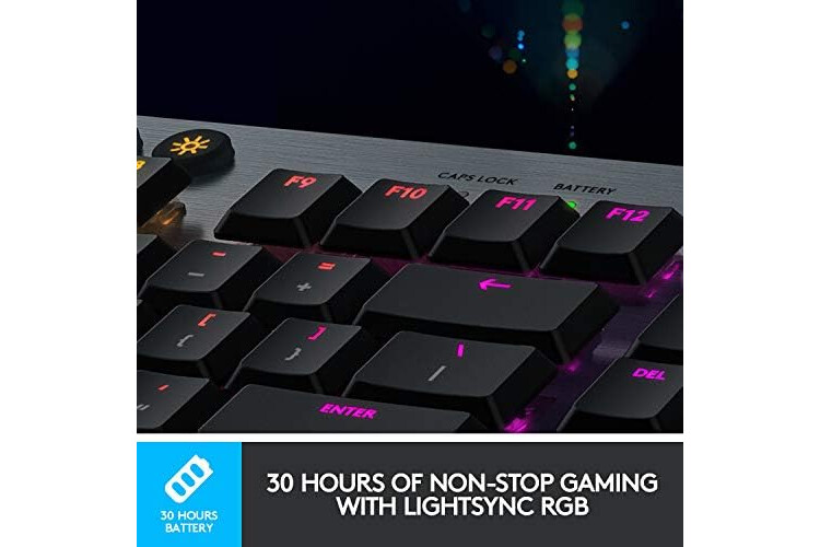 Enjoy 30 hours of game time on a single charge. Low battery warnings at 15 percent on the keyboard battery LED and via pop-up notification in the Logitech G HUB software. Quickly recharges in 3 hours.