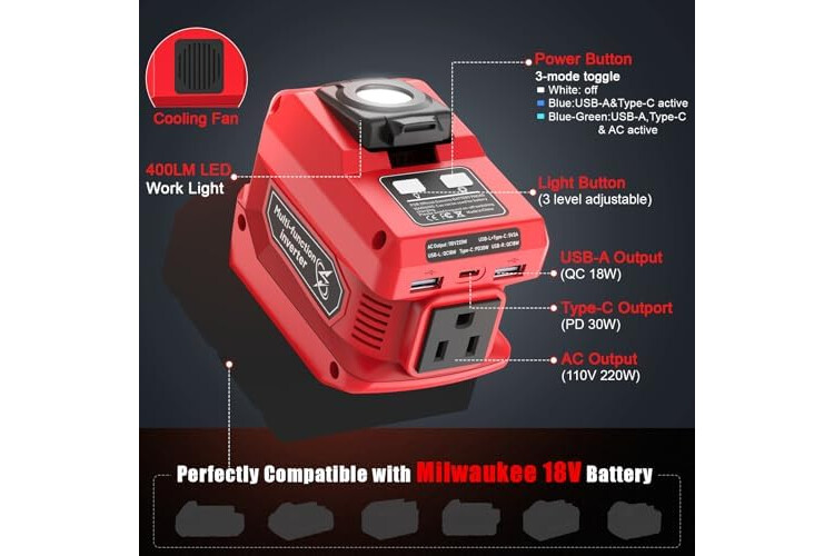 220W Portable Power Inverter Compatible with Milwaukee 18V Battery, DC 18V to AC 110V Battery Inverter, with 400LM LED Work Light, 1 AC Outlet, 2 USB Ports &1 Type-C, Fast Charging