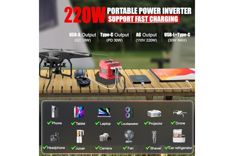 [220W Power Inverter]: This DC 18V to AC 110V-120V inverter allows you to use the battery as a portable power source for small electronic devices, such as mobile phones, laptops, computers, tablets, cameras, headphones, lamps and more