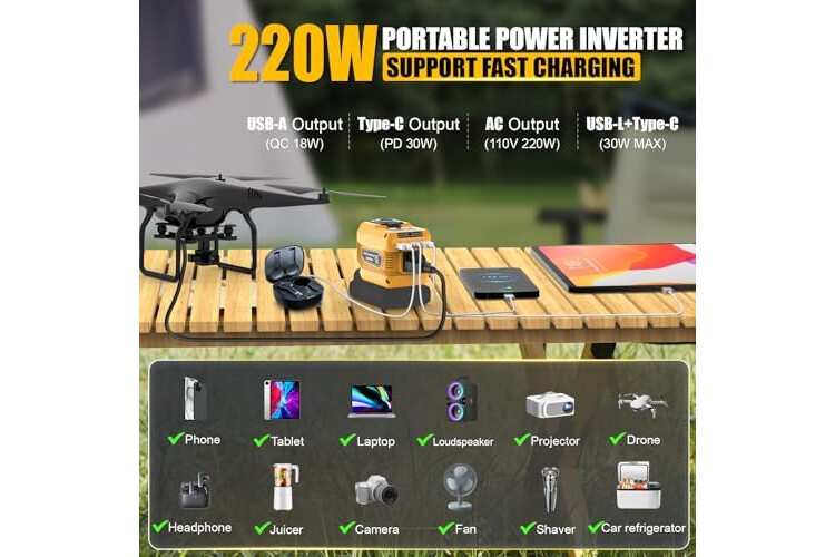[220W Power Inverter]: This DC 20V to AC 110V-120V inverter allows you to use the battery as a portable power source for small electronic devices, such as mobile phones, laptops, computers, tablets, cameras, headphones, lamps and more