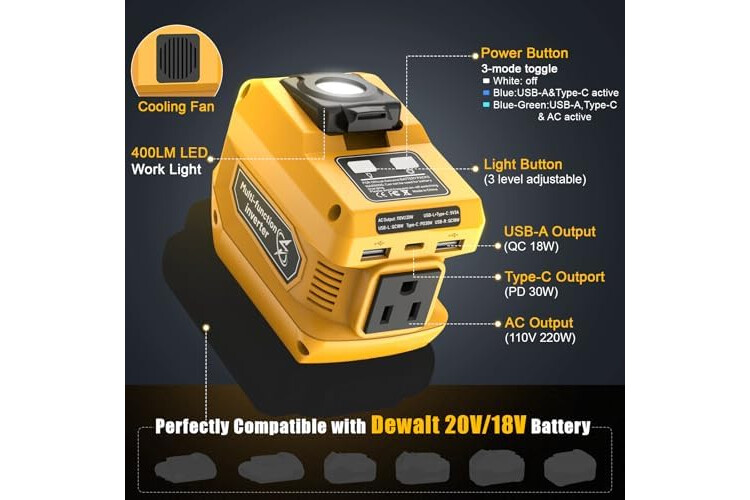 220W Portable Power Inverter Compatible with Dewalt 20V Battery, DC 20V to AC 110V Battery Inverter, Power Station with 400LM LED Work Light, 1 AC Outlet, 2 USB Ports &1 Type-C, Fast Charging