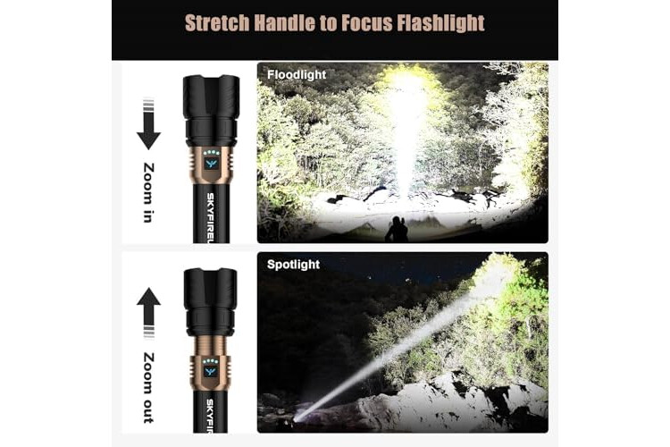 ăHigh-Lumen LED with Adjustable FocusăGet 2000lm of brightness with SKYFIRE LED flashlight, designed to illuminate up to 5000 feet away or cover the area of two football fields.Adjustable zoom allows you to switch between spotlight and floodlight,making it perfect for home use and outdoor adventures.Note:Remove transparent insulating film before use,or the flashlight wonât work