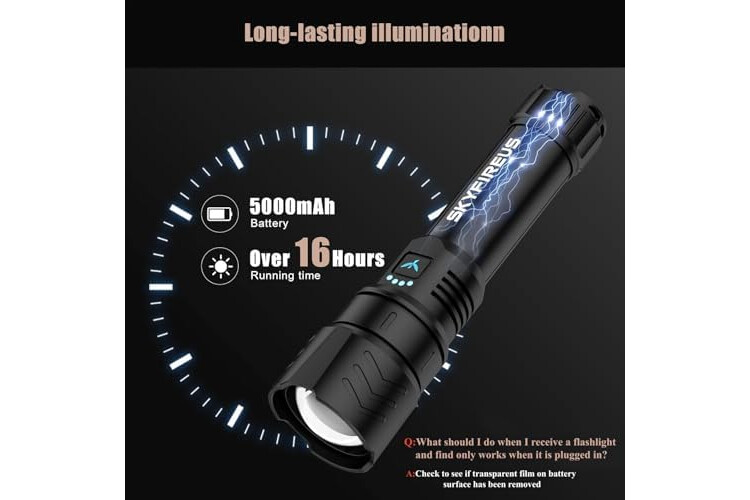 ăRechargeable,Powerbank & Long LastingăSKYFIRE rechargeable flashlight features fast Type-C charging and reverse charging to power your devices in special circumstances, and can be charged by connecting to any adapter by our USB connector. It comes with lithium batter...