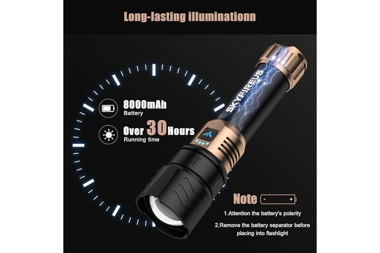 【Rechargeable,Powerbank and Long Lasting】 SKYFIRE 8000mAh rechargeable flashlight features fast Type-C charging and reverse charging to power your devices in special circumstances, and can be charged by connecting to any adapter by our USB connector. It comes with lithium batteries that provide up to 30 hours of use and includes a convenient Battery Level Indicator to keep you informed of remaining power