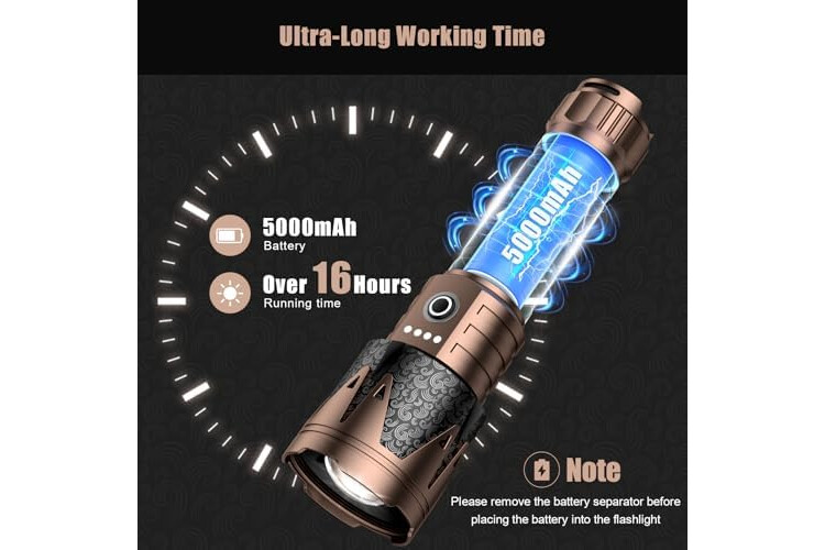 【Essential Tool for Outdoor Gearhead】Equipped with a 5000mAh battery,SKYFIRE rechargeable flashlight supports Type-C charging and reverse OUTPUT, allowing for long-lasting use(16 hours) while also providing emergency charging for your devices. With our flash light,you can embark on worry-free adventures anytime.Note:Please remove transparent insulating film before use, or the flashlight won’t work