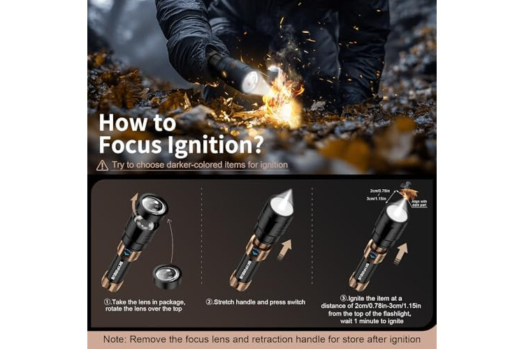 【Skyfire Patented Focusing Ignition Lens】Skyfire flashlight features the optical-grade acrylic lens with a precision parabolic design for an ultra-concentrated beam that ignites dark-colored dry materials in just 3s. With focusing lens, it not only starts fires but can also boil water directly—essential tool for outdoor heating and cooking