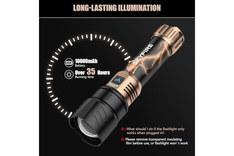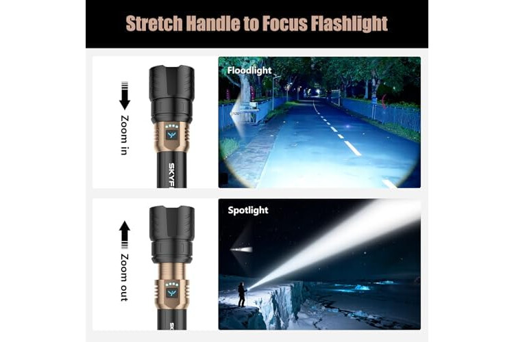 ăHigh-Lumen LED with Adjustable FocusăGet 2000lm of brightness with SKYFIRE LED flashlight, designed to illuminate up to 5000 feet away or cover the area of two football fields.Adjustable zoom allows you to switch between spotlight and floodlight,making it perfect for home use and outdoor adventures