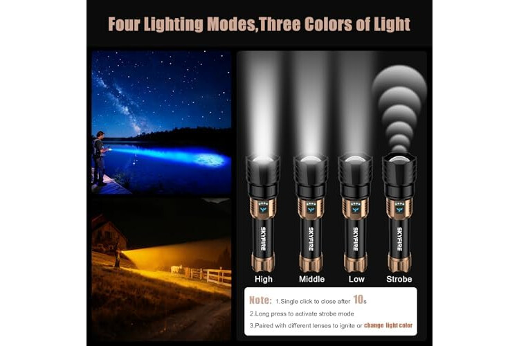 SKYFIRE Rechargeable Flashlights High Lumens with Ignition Lens&White Yellow Blue Light,10000mAh LED Super Bright Flashlight,Zoomable,4 Modes,Waterproof Tactical Flash Light for Outdoor,Home &Gift