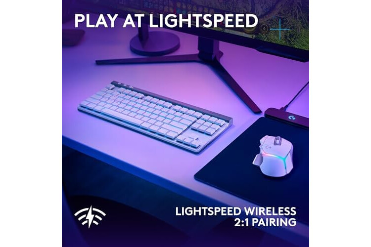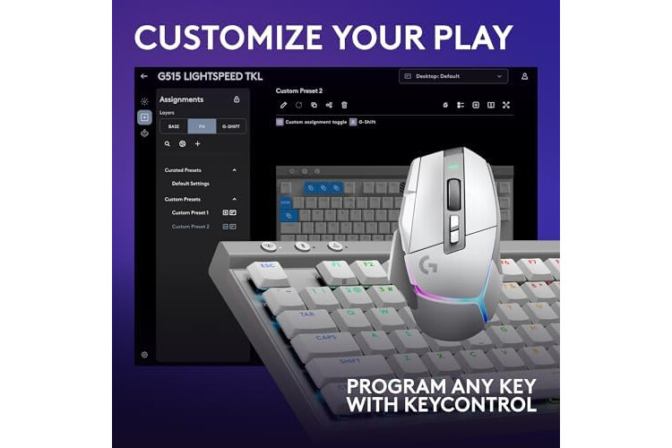 Play faster with G515 LIGHTSPEED TKL gaming keyboard and G502 X PLUS gaming mouse. G515 LIGHTSPEED TKL delivers low-profile design with high-performance engineering. Tri-mode connectivity allows users to play with LIGHTSPEED wireless, Bluetooth®, and wired data mode. Tenkeyless design and 22 mm height create a sleek aesthetic. Low-profile GL mechanical switches (tactile and linear) are factory-lubed for quieter sound and faster actuation. Double-shot PBT keycaps offer durability. Sound dampening construction and foam layer absorb sound for quieter play. Map any key and set five unique layers with KEYCONTROL. Enjoy up to 36 hours of battery life. G502 X PLUS is an icon reimagined with the latest innovations in gaming technology. Hybrid optical-mechanical LIGHTFORCE switches achieve higher levels of speed with satisfying crisp actuation. HERO 25K gaming sensor provides sub-micron accuracy and precision. Redesigned DPI-shift button allows you to customize to fit the shape of your hand: shift, reverse, and remove. Dual mode-scroll wheel scrolls freely or precisely in ratchet mode; L/R tilt are programmable for customizable play. Enjoy up to 120 hours of battery life, 37 with RGB on. Pair G515 LIGHTSPEED TKL and G502 X PLUS on a single USB with 2:1 LIGHTSPEED wireless pairing. Connect with LIGHTSYNC RGB and access ~16.8 M colors and unify your gear with customized illumination through G HUB.