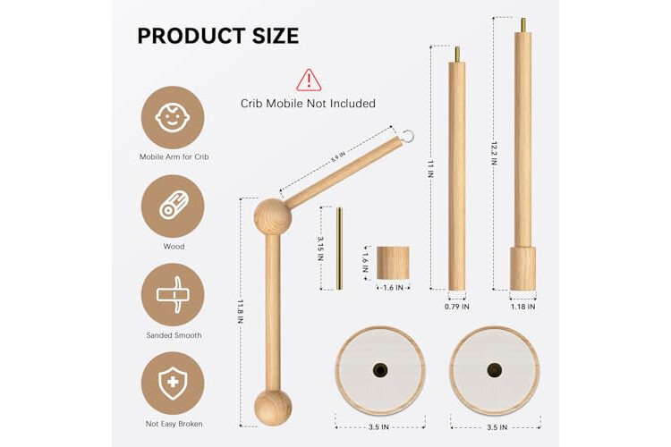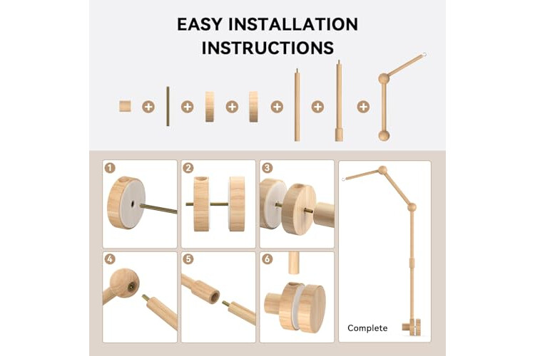 【Quick & Tool-Free Setup】Designed for hassle-free assembly, this crib mobile hanger requires no tools and comes with simple instructions. Just connect the wooden poles and attach the mobile arm to your crib’s rails (fits rails 0.1"–1.1" thick). With a height of 33.86 inches, it positions mobiles perfectly for your baby’s enjoyment.