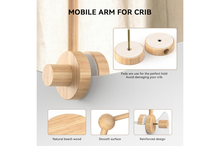 【High-Quality Natural Wood】Crafted from sturdy, natural beech wood, this baby crib mobile arm ensures a smooth and safe experience for your little one. The gentle silicone pads protect both your crib and your baby’s delicate skin while providing a secure, non-slip grip—making this mobile holder for crib a standout choice for nursery decor.