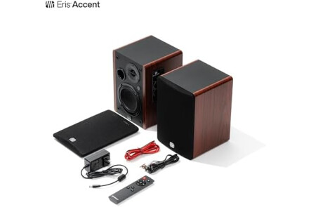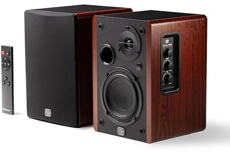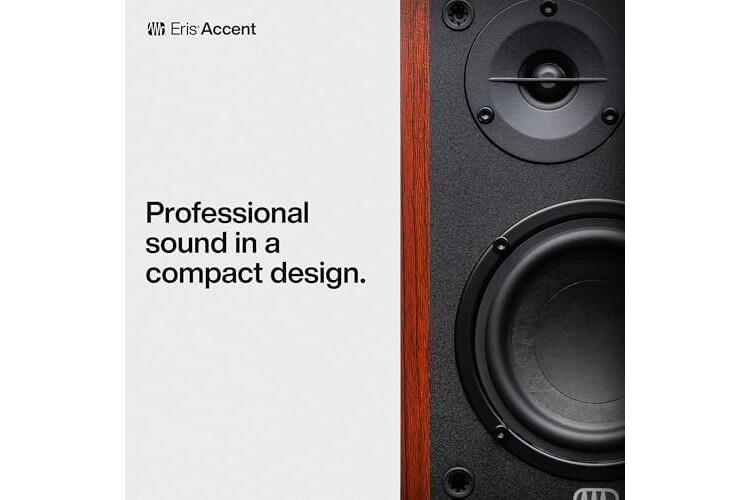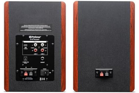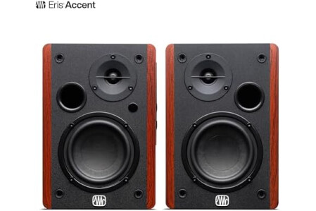 PreSonus Eris Accent Powered Bookshelf Speakers – 50W Wired Stereo Speakers for Record Player, Turntable, Desk & Home, Multiple Inputs, 4” Woofer, Studio Monitors, Tweeter, Remote, Sub Out, Wood Grain