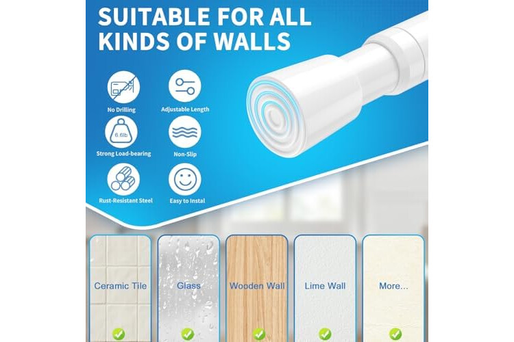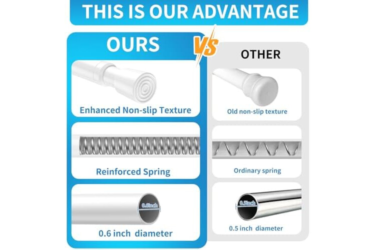【Premium Material】The white tension rod body is made of sturdy 50CrVA high carbon steel material, with an internal 2.5MM reinforced spring providing a support force of 6.6 pounds.