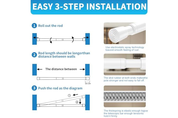 【Stylish Design】The surface of the spring rod is smooth and neat, with a simple and beautiful style. Our curtain rod is not only practical but also in line with modern aesthetics, making it an ideal choice for enhancing the aesthetic se...