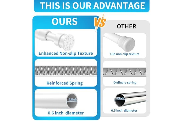 【Quality materials 】The Upgrade Spring Tension Rod is made from metal and non slip plastic rubber ends.