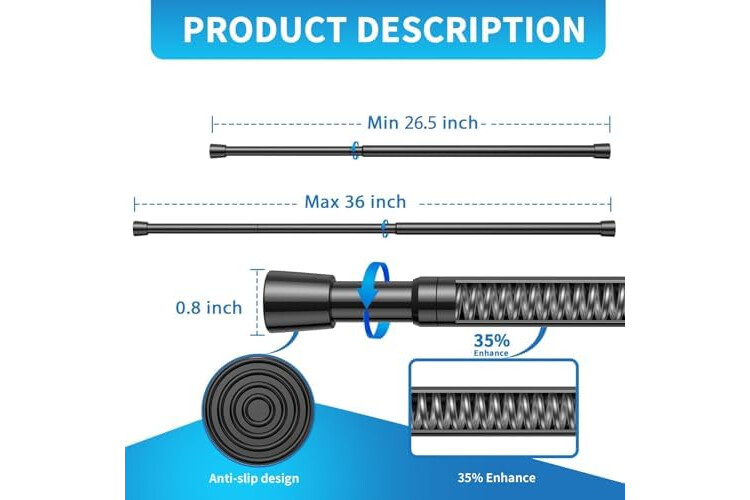 【Premium Material】The black tension rod body is made of sturdy 50CrVA high carbon steel material, with an internal 2.5MM reinforced spring providing a support force of 6.6 pounds.