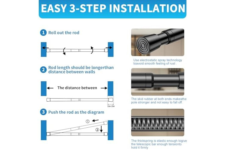 【Stylish Design】The surface of the spring rod is smooth and neat, with a simple and beautiful style. Our curtain rod is not only practical but also in line with modern aesthetics, making it an ideal choice for enhancing the aesthetic se...