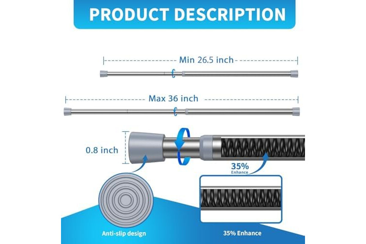 【Premium Material】The silver tension rods body is made of sturdy 50CrVA high carbon steel material, with an internal 2.5MM reinforced spring providing a support force of 6.6 pounds.