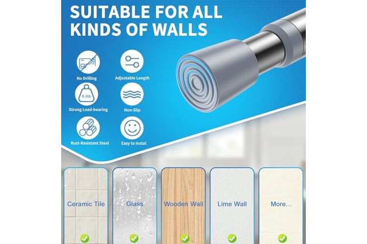【Anti-slip Reinforcement】The head of the tension rods is made of the latest anti-slip material, which is soft and does not damage the wall surface, increasing the friction by 53% under the same contact area.